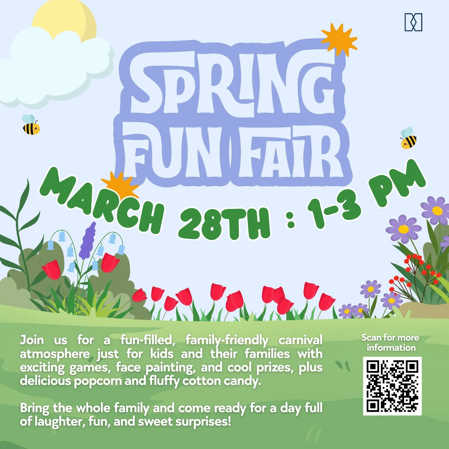 Get ready for an afternoon packed with laughter, games, and sweet treats at our Spring Fun Fair! Bring the whole family and enjoy exciting carnival games, awesome prizes, cotton candy, popcorn, face painting and more!
