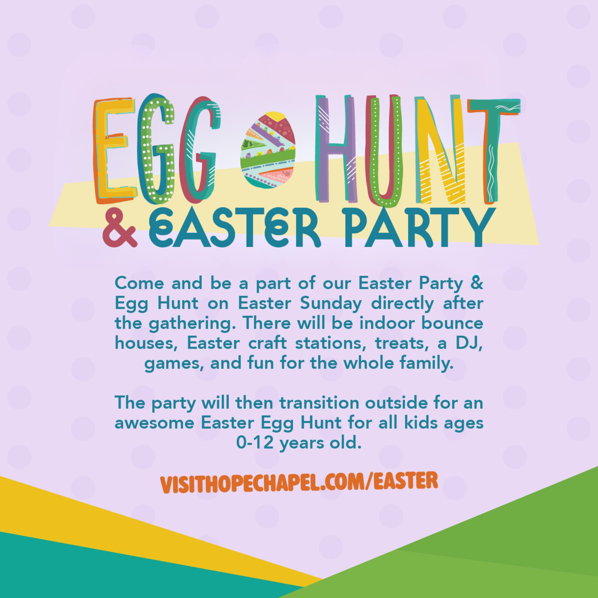 We are having an Egg Hunt & Easter Party, there will be indoor bounce houses, Easter craft stations, treats, a DJ, games, and fun for the whole family. the party will then transition outside for an awesome Easter Egg Hunt.